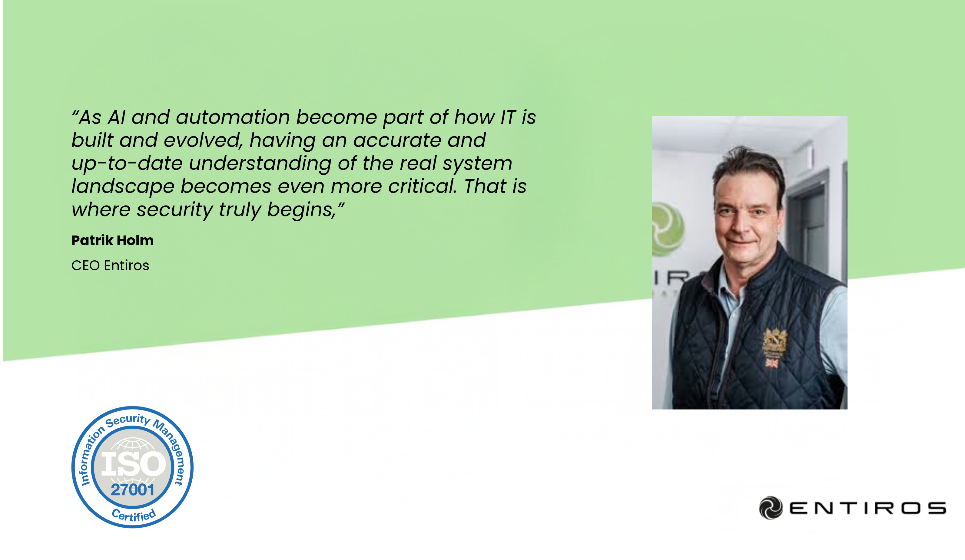 “Security is not just about policies or certifications. It is about having real control over how systems, integrations and data flows actually work in practice,” says Patrik Holm, CEO of Entiros.